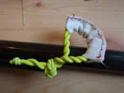 Une fois la tresse reliée à l'élastique, il faut la bloquer entre 2 emmanchements de canne, comme ceci :