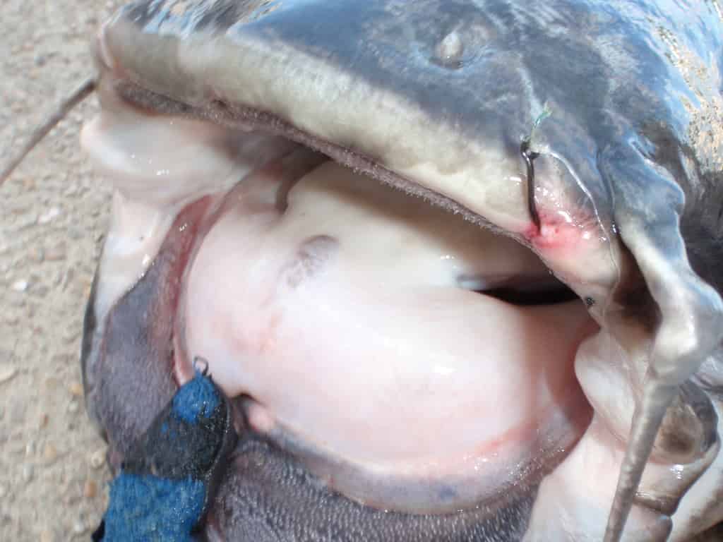 Après 15 minutes de combat, puis une ballade sur le bateau, canne à la main, pour accéder à la mise à l'eau située un peu plus loin : c'est gagné. Voici un magnifique poisson d'1m93, bien muclé. Génial !