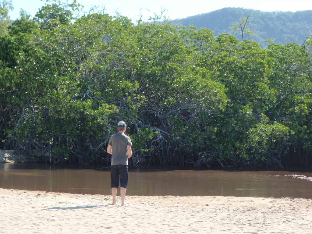 La pêche est bien difficile : je vois beaucoup de poissons, en bordure ou passant en surface, mais très très peu de touches. J'ai même pu apercevoir en surface le "fameux" Barramundi, poisson privilégié des australiens sur tous les plans : difficile à piquer, combat au top et succulent à manger. Sa taille moyenne est de 60/70 cm mais les plus gros peuvent atteindre 1m50.