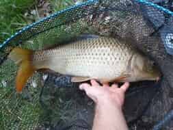 Puis sur une petite touche, l'élastique se mets à sortir ... et c'est parti ! Une carpe de 3/4 kilos rejoins l'épuisette ! Pas énorme, mais c'est toujours mieux que les petits machins de 100 grammes.