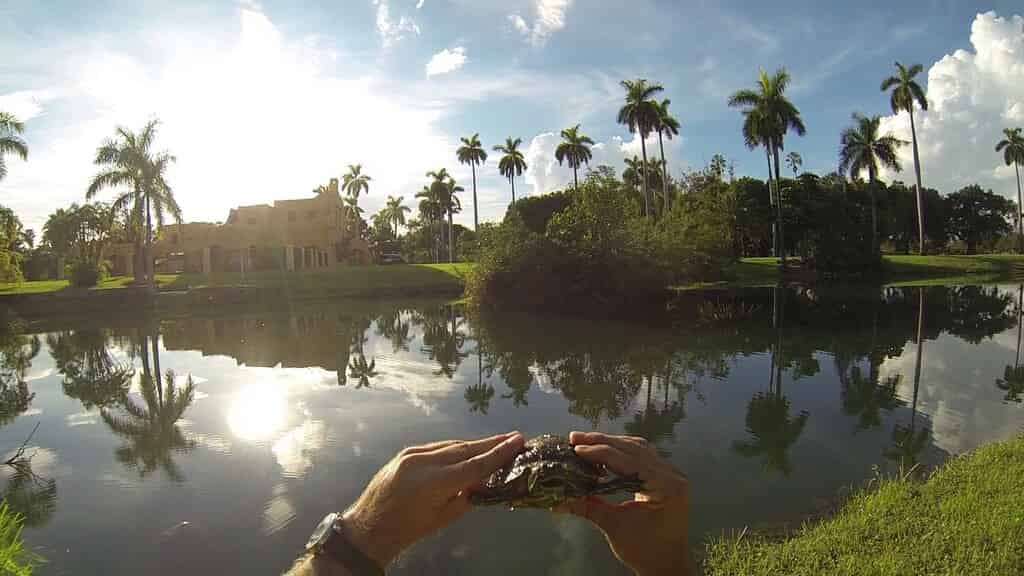 Sur une petite touche aux milieux des branches, j'arrive tout de même à piquer une bestiole inattendue : une tortue de Floride ! Alors bon, j'en avais déjà pris en France, à l'asticot... mais en Floride, c'est tout de même un peu plus naturel ! Je ne savais pas que ça mordait aussi aux leurres...