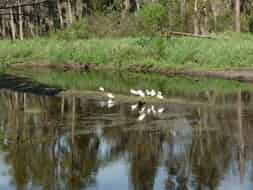 Et pourtant... dans le bras mort, en m'approchant, j'observe un peu partout des petits black-bass et, surtout, des poissons qui m'ont tout l'air d'être les fameux "poisson-alligator" (appelé aussi Lépisosté osseux ou "gar" en anglais). Ici, ils ont l'air de mesurer de 40 à 80 centimètres (pour ceux que je vois en tout cas). Ce poisson a 2 particularités : 1) il a beaucoup de petites dents extrèmement coupantes. 2) Il se tient toujours en surface car il a besoin de respirer de l'air, via une sorte de poumon (en fait, c'est sa vessie-natatoire qui a évolué pour filtrer l'oxygène...).